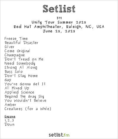 311 headlined their Unity Tour Summer 2025 stop in Raleigh, North Carolina at the beautiful Red Hat Amphitheater. There was a vibe of love throughout the packed amphitheater. Sitting on Saturn and Badflower opened up the show and got the crowd ready for 311. The tour celebrated their new album Full Bloom as well as 30 years of their self-titled Blue Album. The energy was intense, yet fun and the band sounded amazing. The crowd there was definitely digging it as they danced and sang all throughout the set. A full setlist follows the photo gallery.