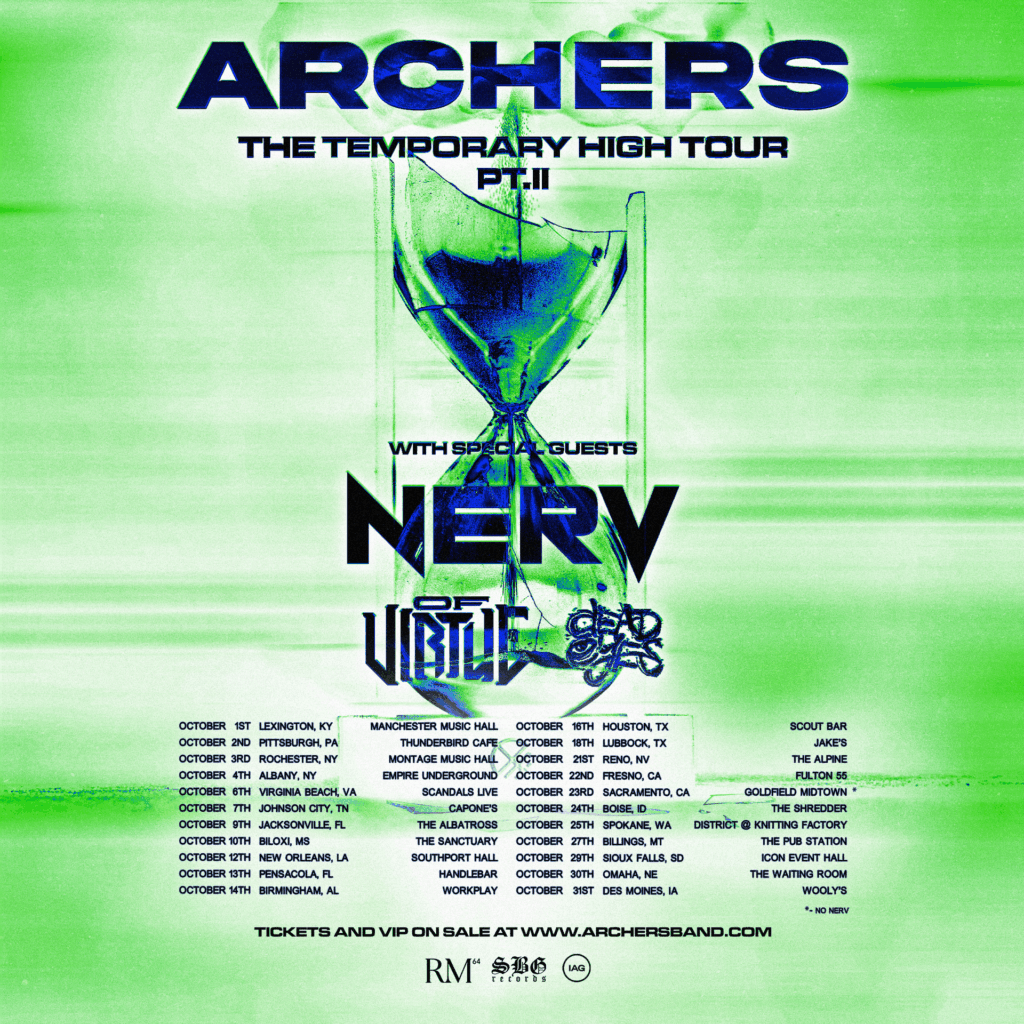 Following a highly successful run on the first leg of their tour, Archers are thrilled to announce ‘The Temporary High Tour Pt. II’, bringing their electrifying live show to even more cities across the country. The tour will feature special guests Nerv, Of Virtue, and Dead Eyes, making for a stacked lineup of heavy hitters in the modern alternative and hard rock scenes.