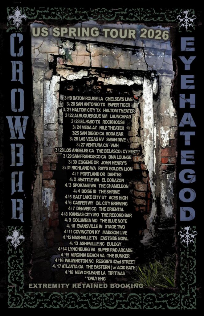 Louisiana metal legends CROWBAR – led by riff lord and vocalist Kirk Windstein with guitarist Matt Brunson, drummer Tommy Buckley, and returning bassist Pat Bruders (Down, ex-Goatwhore) – will join their brethren in Eyehategod for the second leg of their US co-headlining tour this Spring. The journey begins on March 19th in Baton Rouge and runs through April 18th in New Orleans. As an added bonus, Bl’ast will appear on select dates. Tickets are on sale now at crowbarnola.com/tour. See all confirmed dates below.